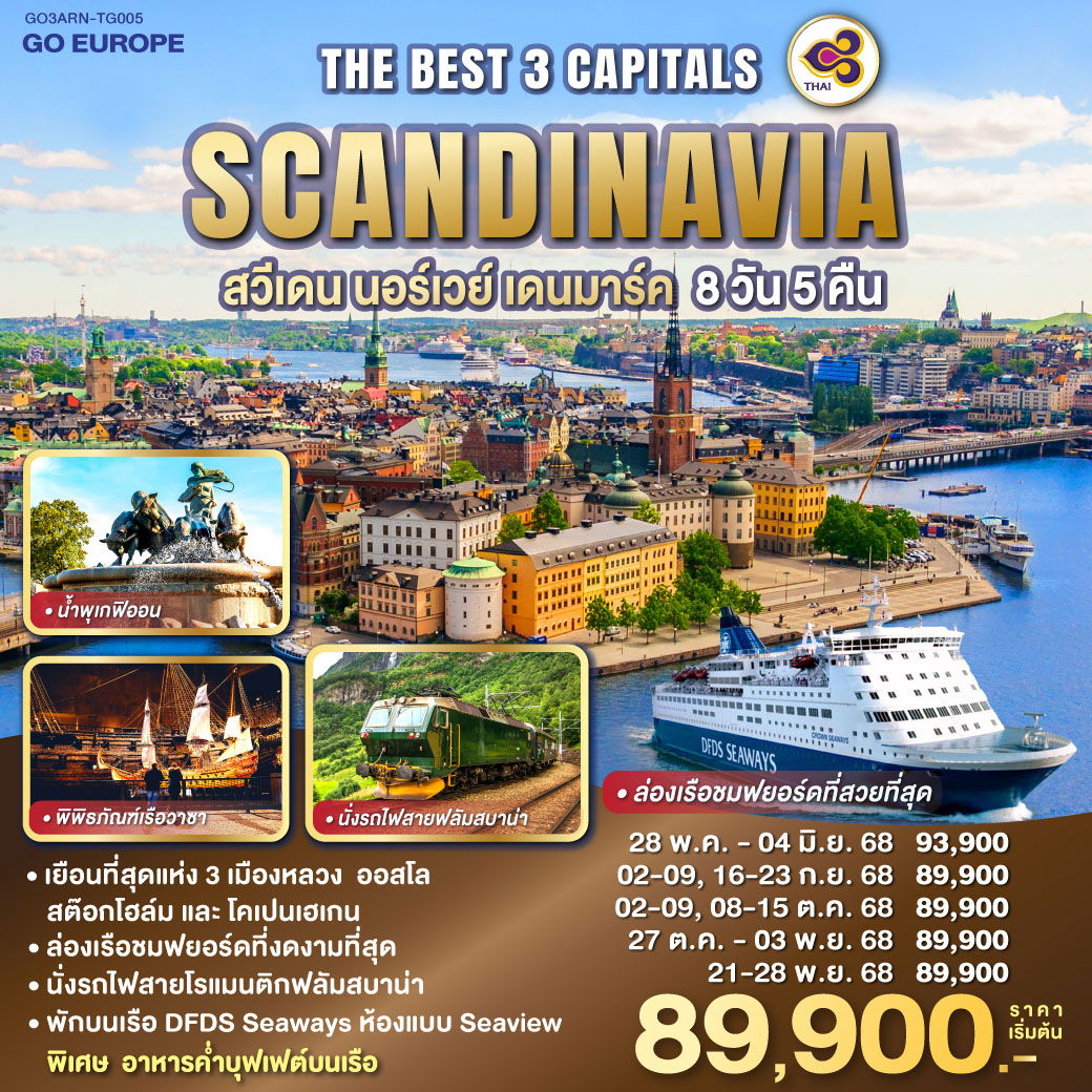 โคเปนเฮเก้น – ชมเมือง – ลิตเติ้ลเมอร์เมด – ท่าเรือนูฮาวน์ ล่องเรือสำราญ DFDS (พักห้อง SEA VIEW) ออสโล – ชมเมือง – สวนประติมากรรมวิกแลนด์ – ฟลัม/วอสส นั่งรถไฟสายโรแมนติก – ล่องเรือชมฟยอร์ด - เบอร์เกน โอเรบรู – สต๊อคโฮล์ม – ชมเมือง – แกมล่าสแตน ตูรกุ – เฮลซิงกิ – ชมเมือง